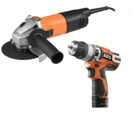 Pack AEG Meuleuse électrique 800W – WS8-125SK – Perceuse à percussion AEG 12V Li-ion, un duo idéal d’outils haute performance pour tous vos chantiers comprenant une perceuse à percussion, une meuleuse avec un système empêchant le redémarrage de la machine après une coupure de courant.