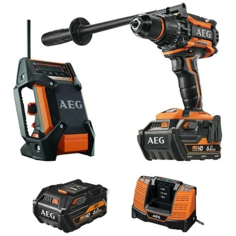 Pack AEG Perceuse percussion Brushless 18V BSB18BL-602C – Radio de chantier 12-18V DAB+ USB BR 1218C-0 – 2 batteries 6.0Ah 1 chargeur, idéal pour faire des travaux tout en se divertissant grâce au poste radio.